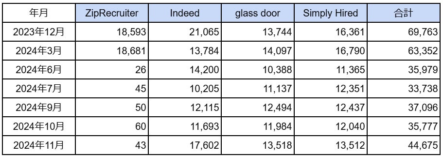 調査対象はZipRecruiter、Indeed、glassdoor、Simply Hiredの4サイトで、調査期間は2024年11月1日~30日です。