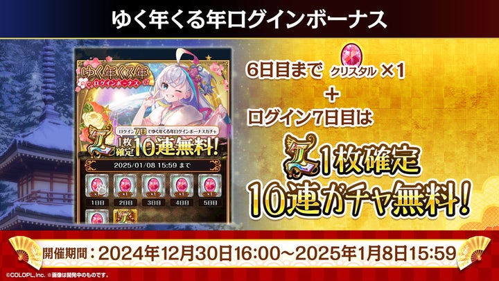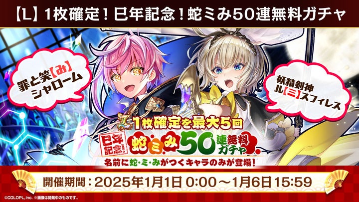 年末年始キャンペーンとして、「ゆく年くる年ログインボーナス」や「巳年記念!蛇ミみ50連無料ガチャ」も用意。