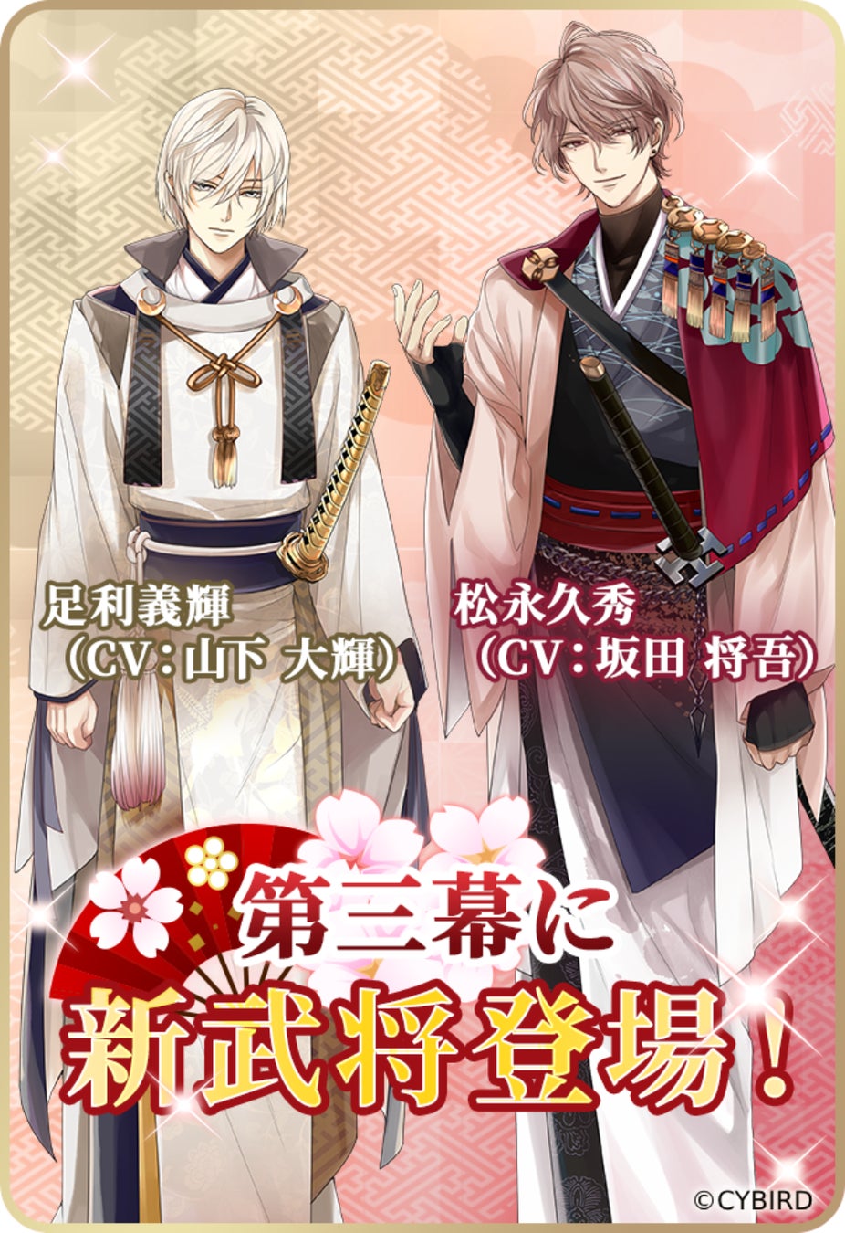 さらに、特別PVでは今後の重大告知や、第三幕に登場する新武将(足利義輝CV:山下大輝、松永久秀CV:坂田将吾)のビジュアルとCVが初公開されました。