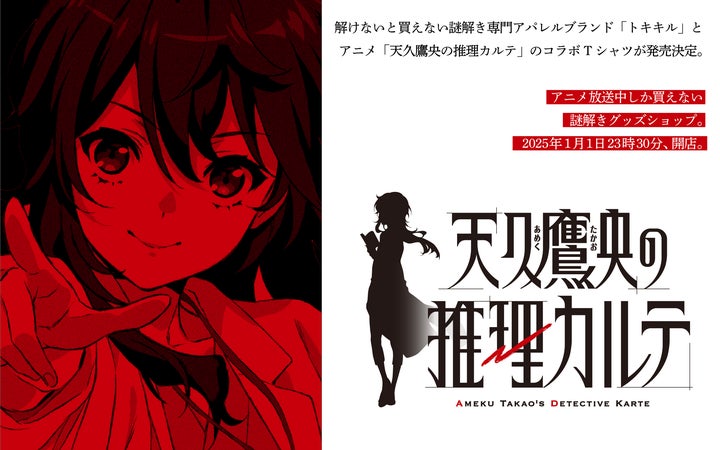 2025年1月1日放送開始のアニメ『天久鷹央の推理カルテ』を記念して、暗号専門アパレルブランド「トキキル」とのコラボTシャツが発売されます。