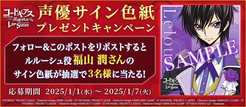 また、ルルーシュ役・福山潤さんのコメントとサイン色紙プレゼントキャンペーンも実施されます。