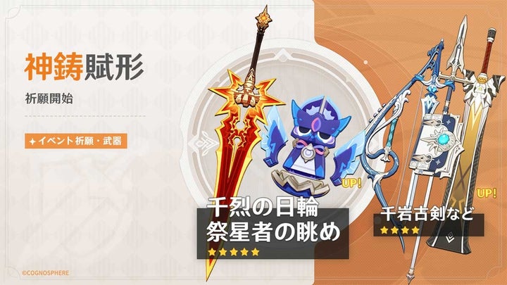 イベント祈願ではマーヴィカとシトラリ、新★5武器「両手剣・千烈の日輪」と「法器・祭星者の眺め」の出現確率がアップします。