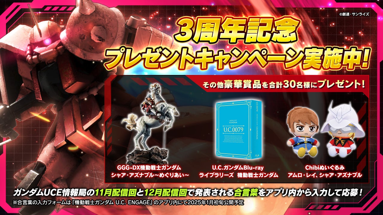 また、3周年記念プレゼントキャンペーンとして、『機動戦士ガンダム』関連商品が30名様に当たるキャンペーンも実施中です。