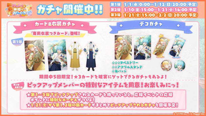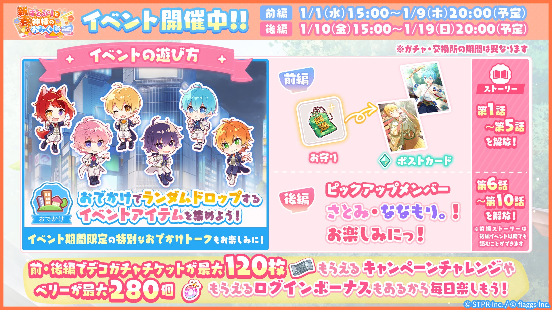 このイベントは、前編・後編・応援イベントの3部構成で1ヶ月間に渡り開催され、お正月をテーマにしたメインストーリーや、イベント限定のカード&衣装ガチャ、デコガチャ、キャンペーンチャレンジなどが用意されています。
