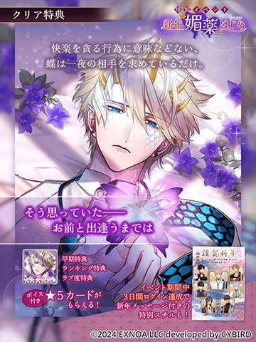 DMM GAMESは、女性向け恋愛ゲーム『夢幻楼と眠れぬ蝶』において、2025年1月1日~13日の期間、新年イベント『煩悩イベント「新年媚薬はじめ」』を開催中。