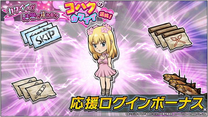 - 『Dr.STONE バトルクラフト』で新キャラ「[SSR][科学?のお化粧]コハク」登場ガチャ開催