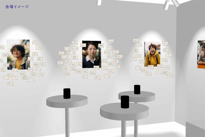 AIが生成した架空の人物画像に、来場者が自由に偏見を書き込む展示コーナーや、偏見に基づいて人物を推理する投票コーナー、フォトブースなどが用意されています。