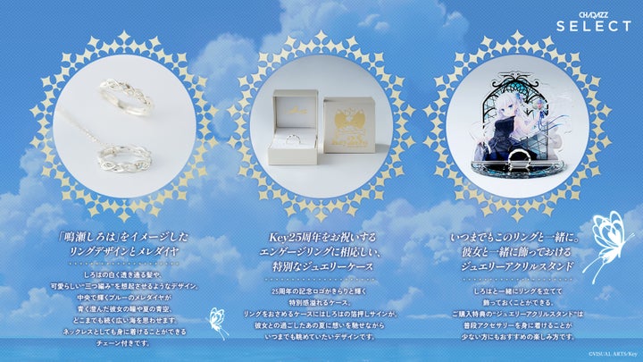 株式会社HIKEが運営するCHARAZZ SELECTは、Keyブランド設立25周年を記念し、『Summer Pockets RB』ヒロイン・鳴瀬しろはをイメージしたエンゲージリングの受注販売を2025年1月10日より開始します。