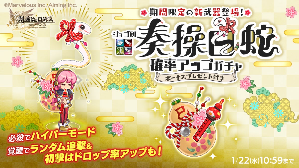 「ジョブ別 白兎神確率アップサポートジョブガチャ」や「ジョブ別 奏操白蛇確率アップガチャ」では、それぞれ新武器が登場し、1月22日まで販売。