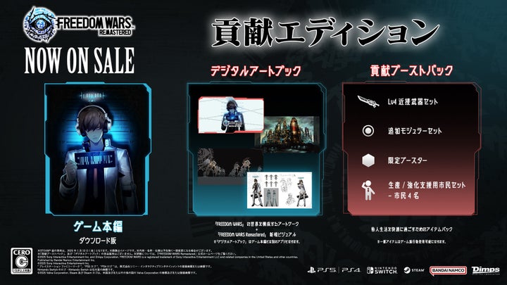 株式会社ディンプスと株式会社バンダイナムコエンターテインメントは、家庭用マルチプレイアクションゲーム『FREEDOM WARS Remastered』をPlayStation®5、PlayStation®4、Nintendo Switchで2025年1月9日に発売しました。