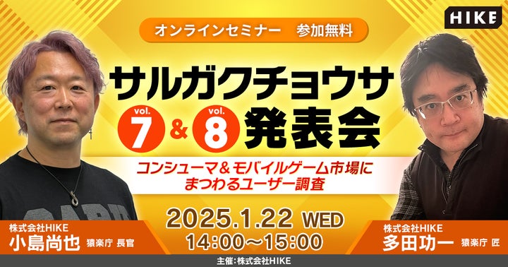 株式会社HIKEのエンタメコンテンツチューニング事業部である猿楽庁は、2025年1月22日(水)に無料オンラインセミナー「サルガクチョウサ発表会」を開催します。