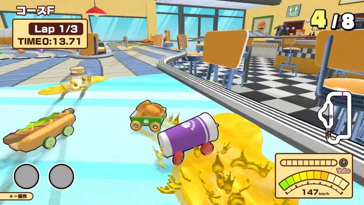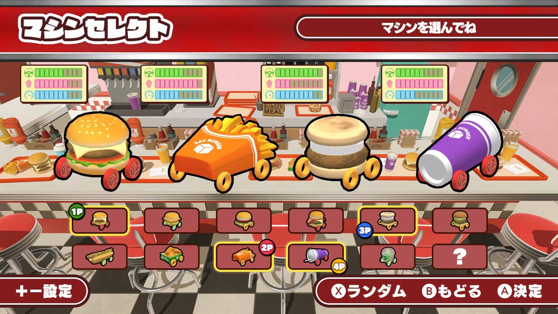 最大4人で遊べるローカルマルチプレイに対応した、ハプニング満載の新感覚バーガーレースゲームです。