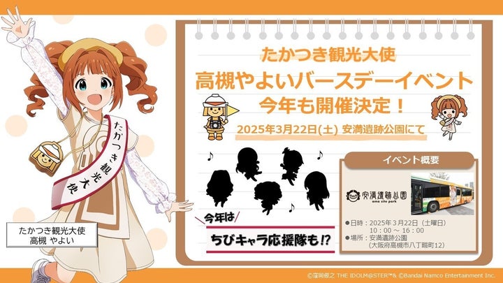 アイドルマスターシリーズ20周年を記念し、高槻市の観光大使を務めるゲーム内アイドル「高槻やよい」のバースデーイベントが、令和7年3月22日(土)に安満遺跡公園で開催されます。