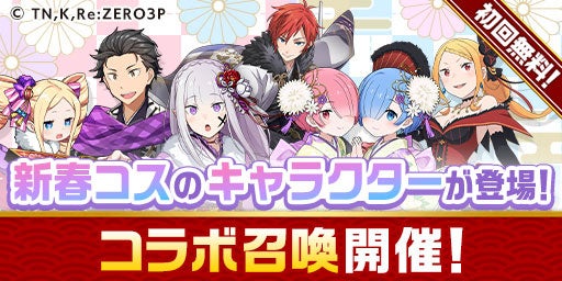 コラボ召喚では、エミリア、スバル、レム、ラムなどの人気キャラクター(一部新春コスチューム)が登場します。