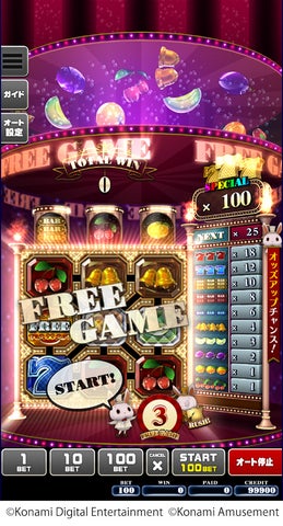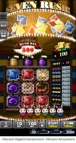 1BETからプレイ可能で、「フリーゲーム」や「セブンラッシュ」などの機能も搭載。