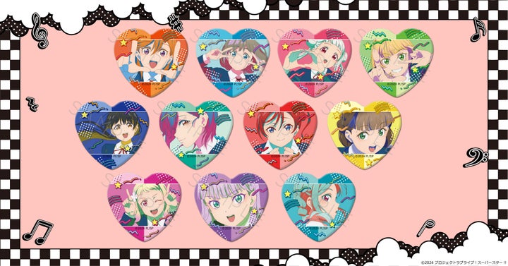 商品はハート型缶バッジ(全11種、660円)、レザーバッジ(全11種、770円)、アクリルスタンド(全13種、1,650円)などです。