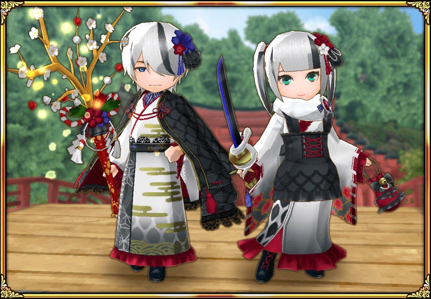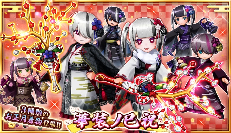 同時に、お正月テーマのガチャ「華装ノ巳祝」も開催中で、3種類のお正月着物や顔変更アイテムが登場します。