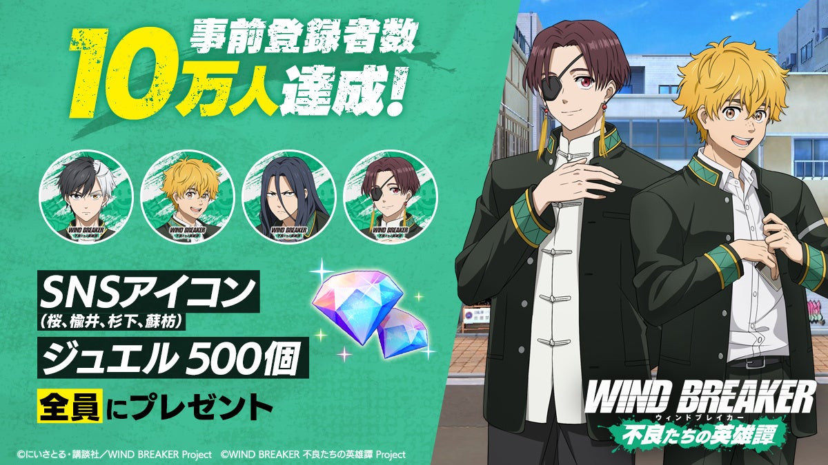 TVアニメ『WIND BREAKER』を題材としたオンラインゲーム『WIND BREAKER 不良たちの英雄譚』(ウィンヒロ)の事前登録者数が10万人を突破し、SNSアイコンとゲーム内通貨「ジュエル500個」の配布が決定しました。