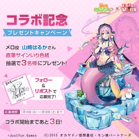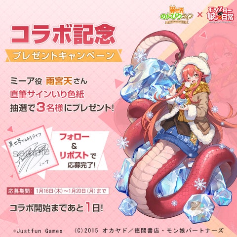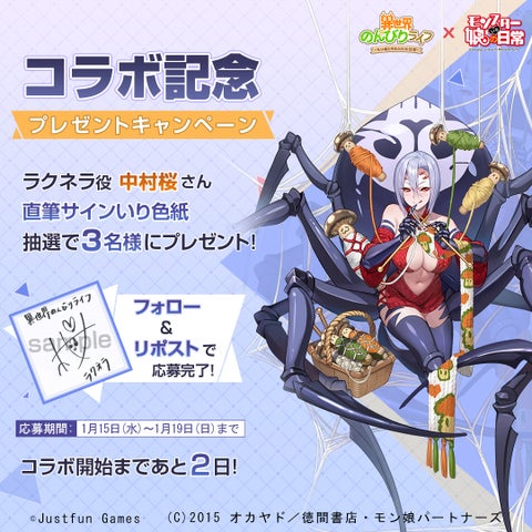 イベントでは、『モンスター娘のいる日常』のキャラクターが登場し、ログインボーナスや、コラボキャラクター声優のサイン色紙が当たるTwitterキャンペーンも実施されます。
