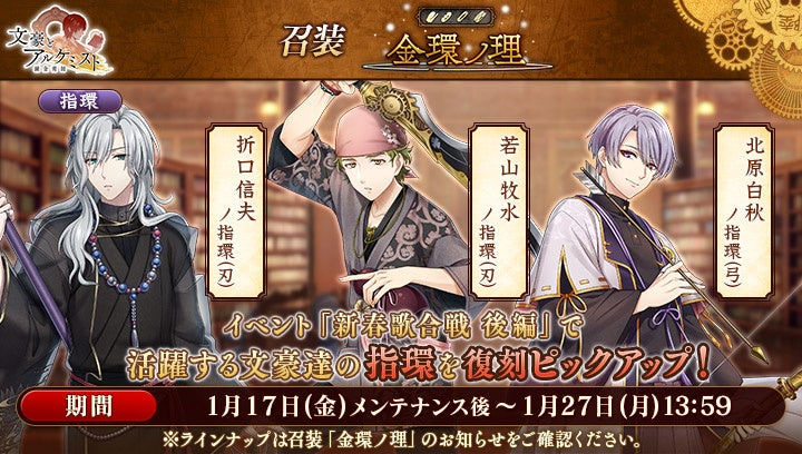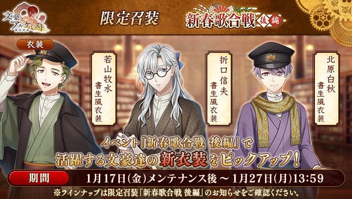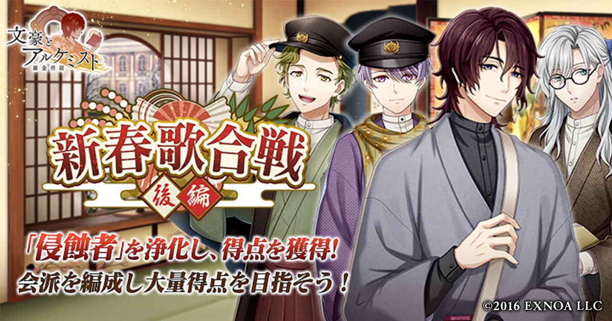 - 『文豪とアルケミスト』で新春イベント『調査任務「新春歌合戦 後編」』と限定召装『新春歌合戦 後編』開催
