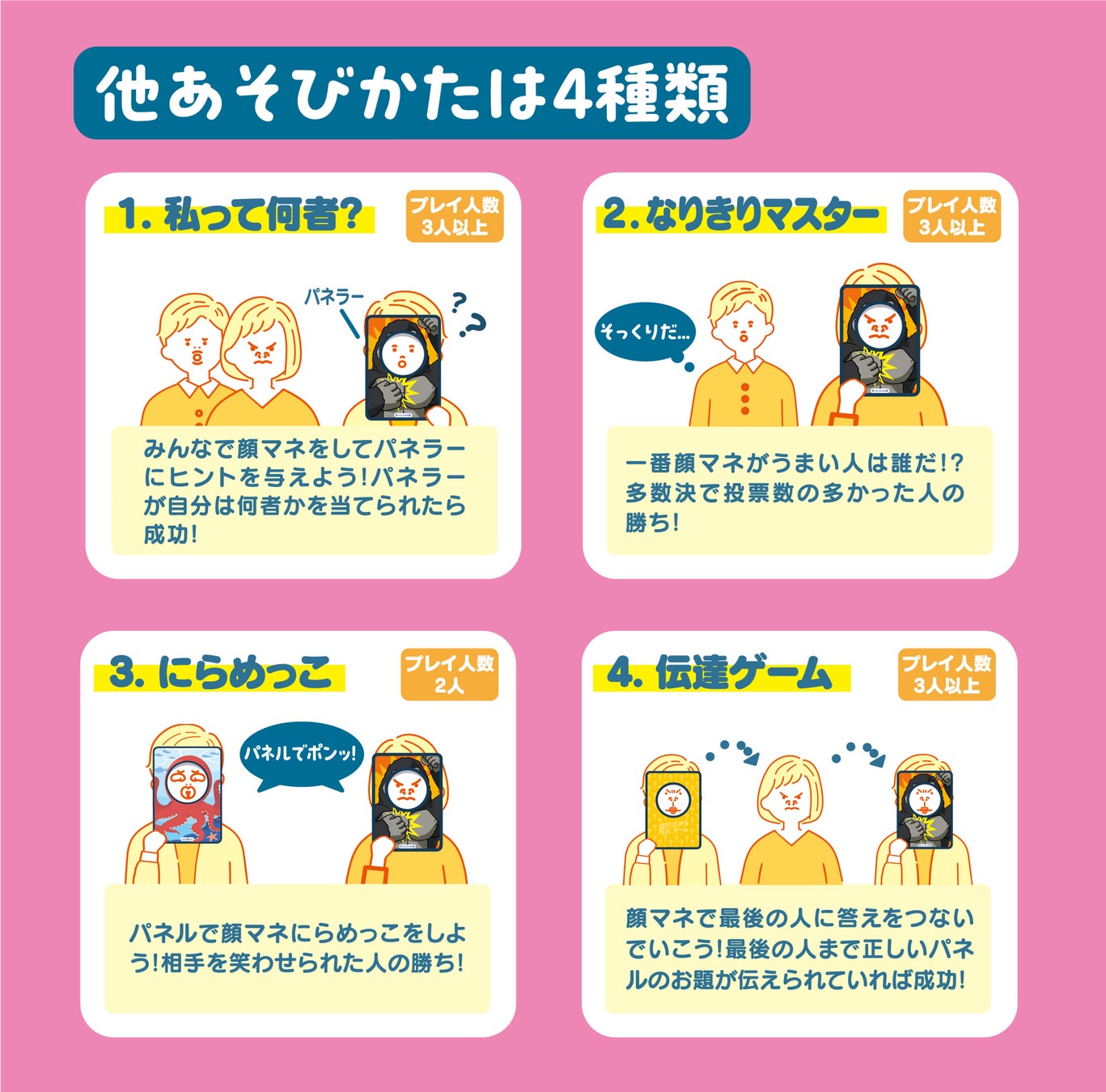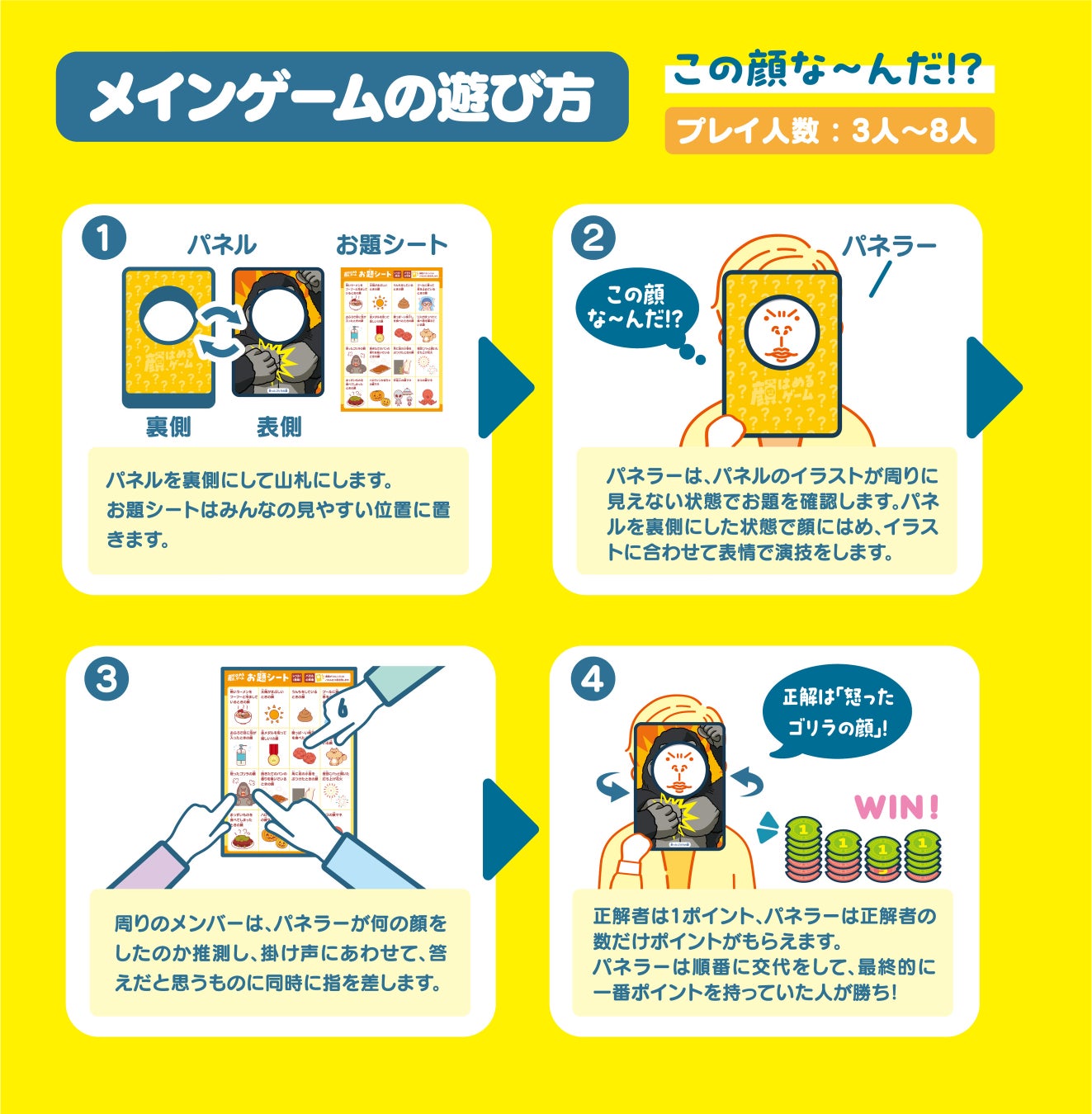 メインゲームでは、パネラーがお題イラストに合わせて顔の表情だけで演技し、他のプレーヤーは回答を推理して指さします。