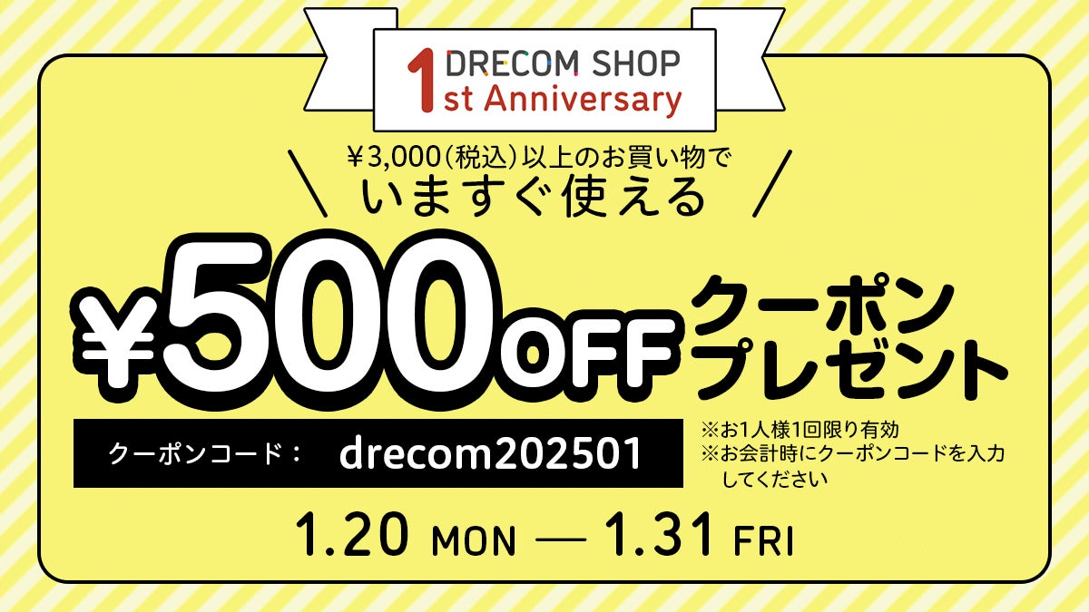 - 「DRECOM SHOP」1周年記念キャンペーンで500円OFFクーポン配布(2025年1月20日~31日、3000円以上購入で利用可能)