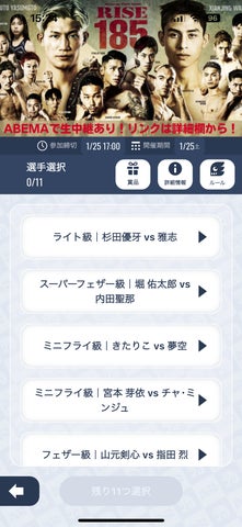予想は勝敗だけでなく、KO・TKO勝ち、判定勝ちなども予想可能で、上位者には『RISE185』出場選手サイン入りポスターや『RISE186』のペアチケットがプレゼントされます。