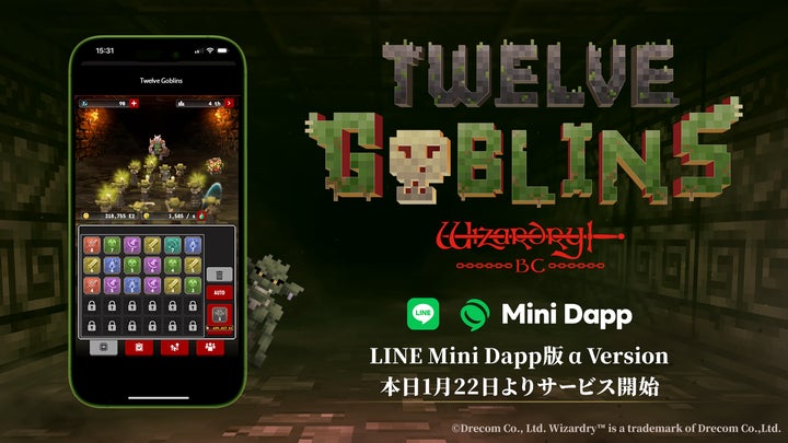 株式会社ドリコムは、自社保有のWizardry IPを活用したWeb3プロジェクト「Wizardry BCプロジェクト」の一環として、メッセンジャーアプリ向けミニアプリ『Twelve Goblins – Wizardry BC – (TGWiz)』のLINE Mini Dapp版αVersionを2025年1月22日にリリースしました。
