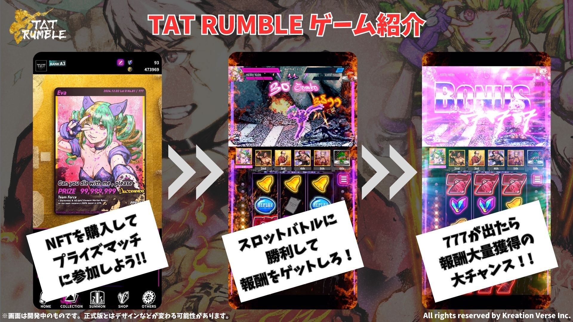 TAT Rumbleは、NFTスロットRPGで、スロットとRPG要素を融合させた新感覚のブロックチェーンゲームです。