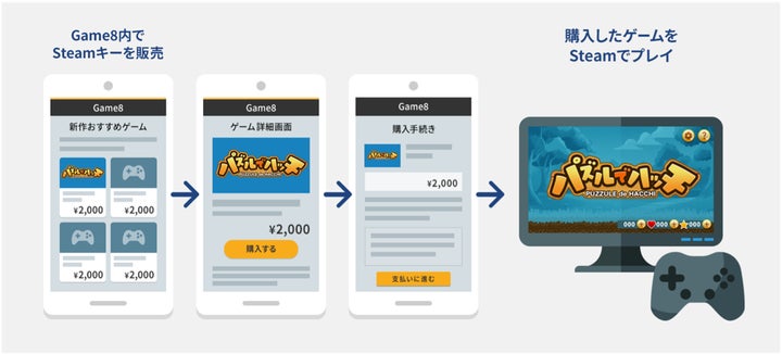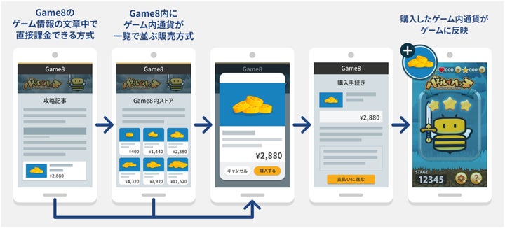 Game8 Storeは、月間5億PVのGame8プラットフォームを活用し、ユーザーはサイト内で課金や購入を完結できる。