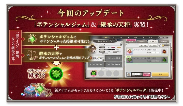 さらに、イマージュ強化に役立つ新アイテム「ポテンシャルジェム」と「継承の天秤【ポテンシャルジェム】」も実装されました。