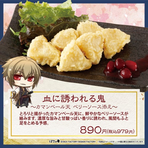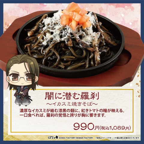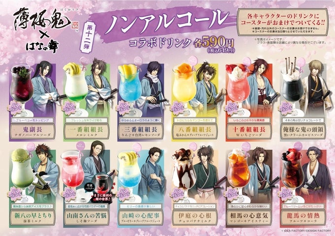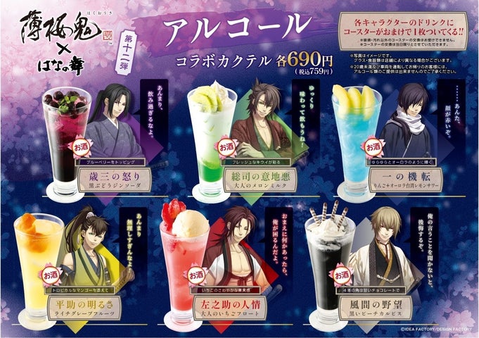 薄桜鬼の世界観を表現したフードメニュー9品と、キャラクターをイメージしたドリンクメニュー18品(アルコール6品、ノンアルコール12品)が登場。