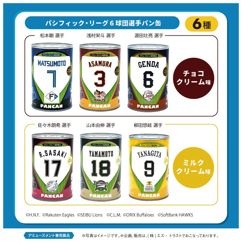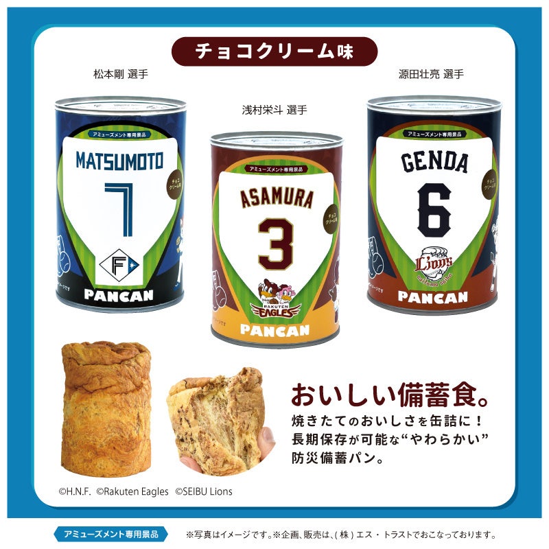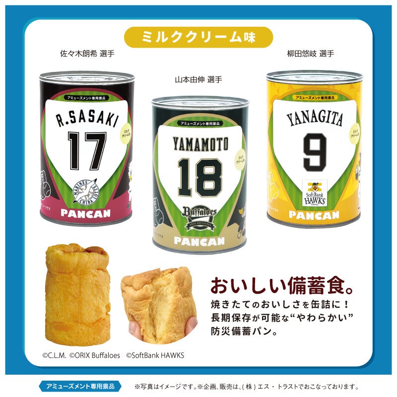 その中には、株式会社パン・アキモト製造の長期保存が可能なおいしい防災備蓄パンが含まれており、パ・リーグ6球団の選手背番号デザインのパン缶や、いちご味のラムネテトラ入りの球団選手の背番号をデザインしたオリジナルBOXもあります。