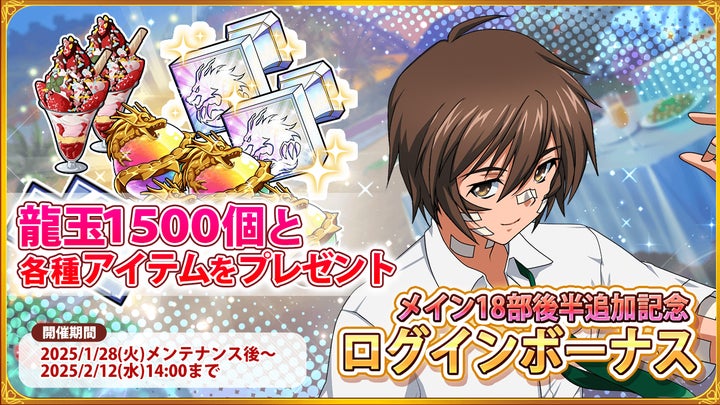 さらに、メインストーリー18部後半追加記念としてログインボーナスで「龍玉1500個」などの豪華アイテムが配布されます。