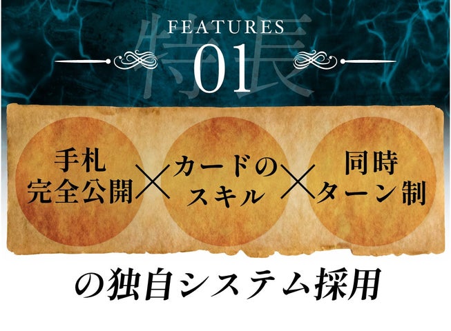 - 手札完全公開、カードスキル、同時ターン制の独自のゲームシステムが特徴