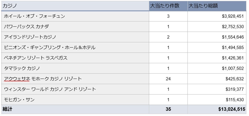 調査によると、大当たり総額は約20億円(1302万ドル)、35件(9カジノ)の大当たりが発生し、最高額はパワーバックス カナダの約4.3億円(275万ドル)でした。