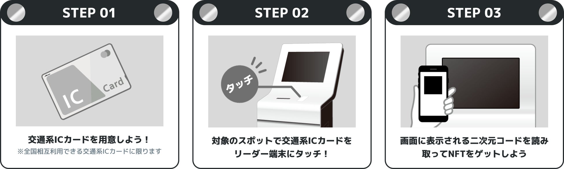 交通系ICカードを専用端末にかざし、スマートフォンゲーム『ソダテツ』と連携して、鉄道車両の限定NFTデジタルアイテムを獲得できます。