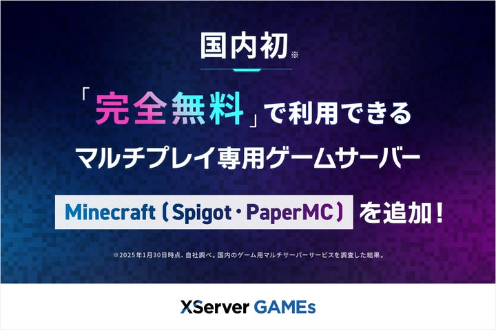 エックスサーバー株式会社は、2025年1月30日より、ゲームサーバー専用サービス『XServer GAMEs』において、プラグイン対応のマインクラフトサーバー「Spigot」「PaperMC」に対応した完全無料のマルチプレイサーバーを提供開始しました。
