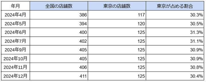 東京は125店舗で全体の30.4%を占めており、前月と比較して横ばいとなっています。