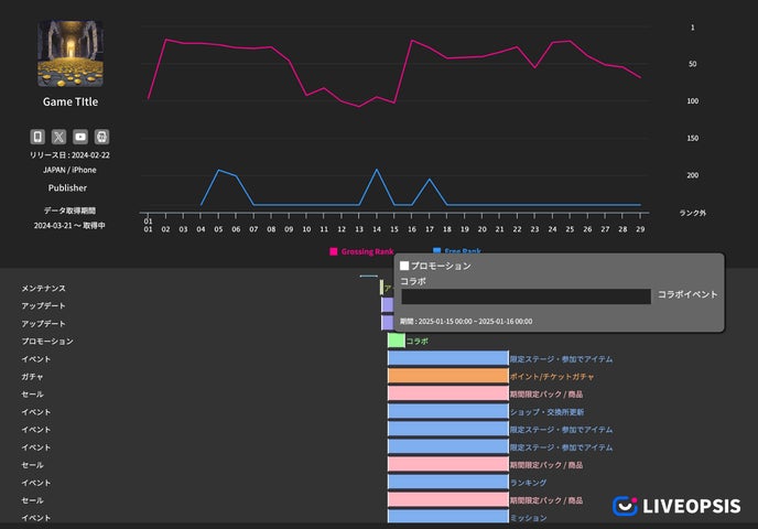 LIVEOPSISは、ストアランキングや施策解析、事前登録情報、コラボ情報、SNS分析、市場レポートなどを提供するサービスです。