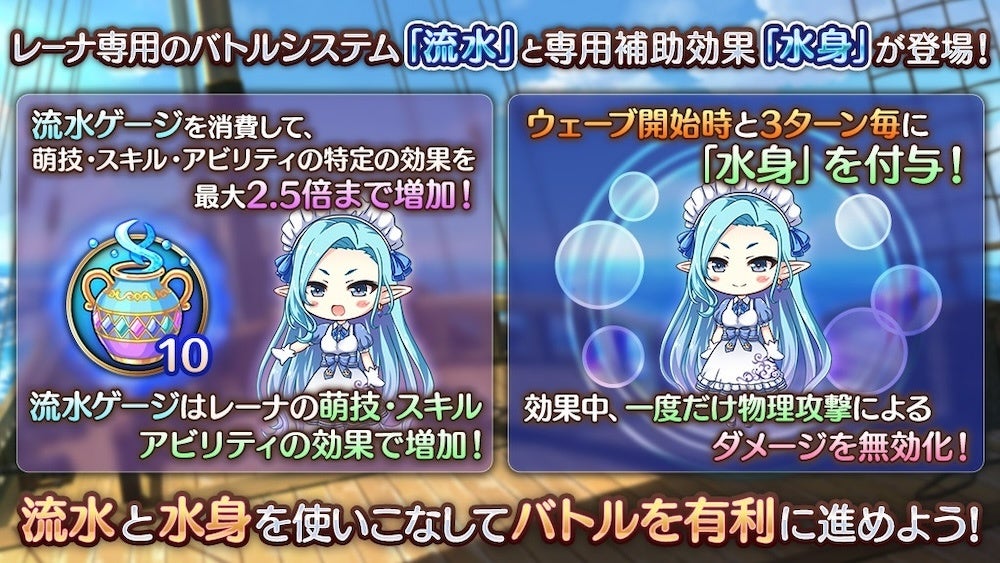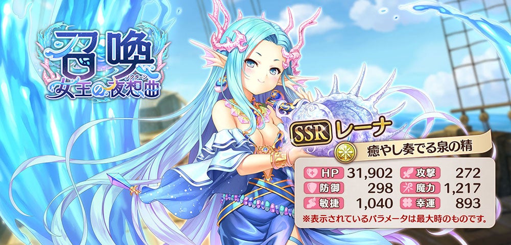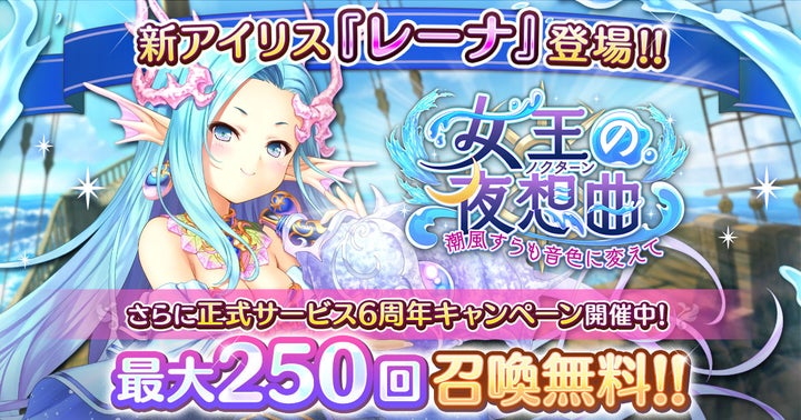 レーナ専用のバトルシステムやフィールド効果も実装され、さらに、レーナの聖装を入手できる期間限定イベント『女王の夜想曲 潮風すらも音色に変えて』や、最大250回召喚無料の6周年キャンペーンも同時開催されています。