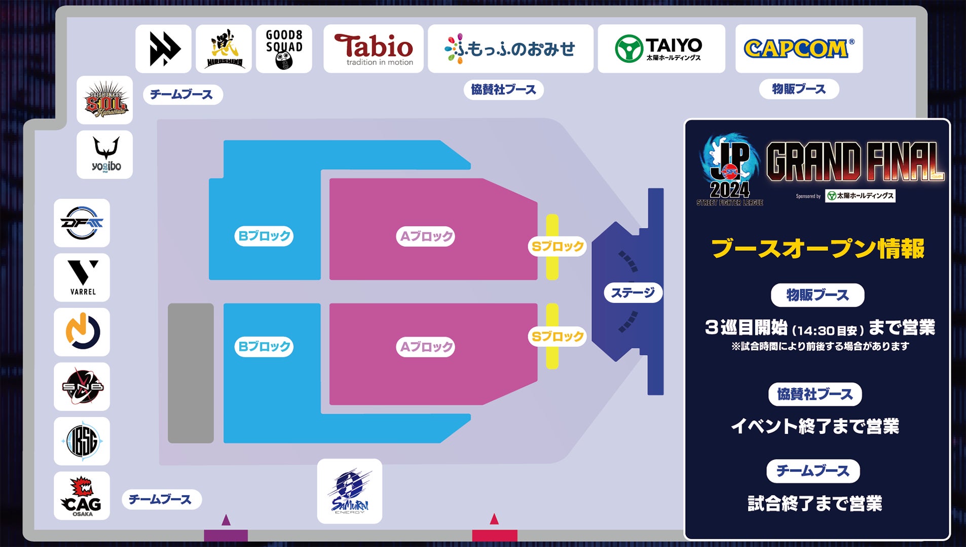 会場には、太陽ホールディングス、ふもっふのおみせ、サムライエナジー、タビオといったスポンサーブースに加え、カプコン公式物販ブース、出場チームのブースも出展予定です。