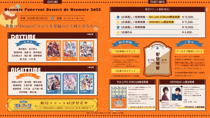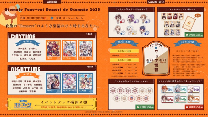 アイディアファクトリー株式会社の女性向けゲームブランド「オトメイト」は、2025年2月23日(日)に開催されるファンイベント「Dessert de Otomate 2025」の物販情報を公開しました。