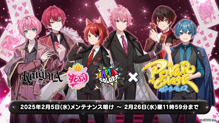 株式会社Skyfallが運営するバトロワ式オンラインポーカーゲーム『ポーカーチェイス』にて、すとぷり、Knight A – 騎士A -、AMPTAKxCOLORSの計6名の人気2.5次元歌い手アイドルグループとのコラボイベントが、2025年2月5日〜2月26日の期間限定で開催されます。