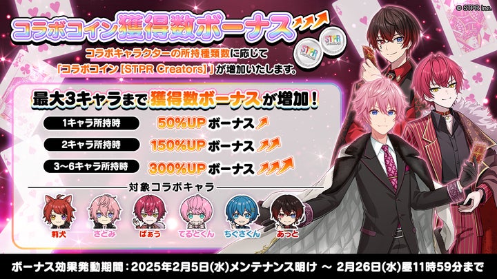 コラボキャラクター獲得数に応じて、コラボコインの獲得数が増加するボーナスも用意されています。