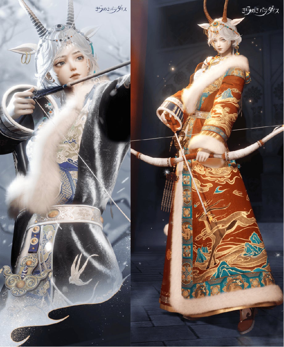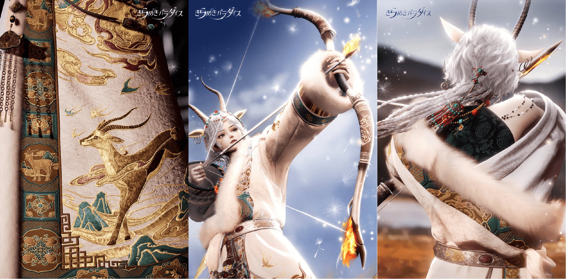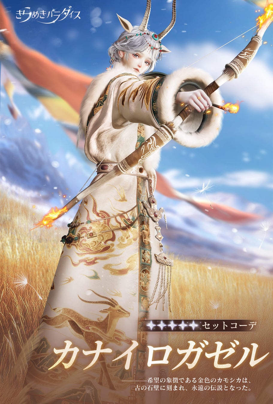 今回のコラボでは、平安と幸福を象徴するカモシカ模様をメインにデザインされた星5セットコーデ『カナイロガゼル』が登場。
