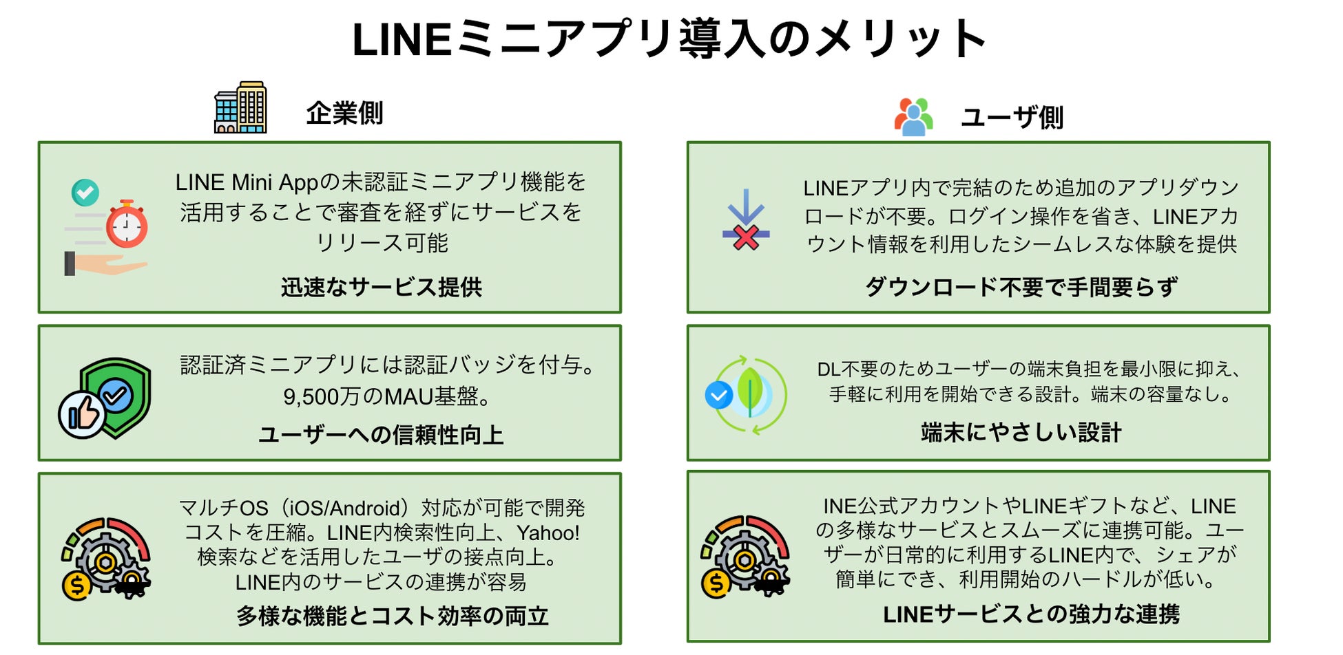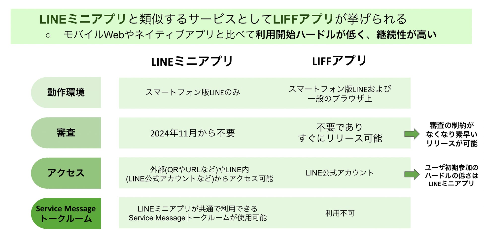 - LINEミニアプリはダウンロード不要で、LIFFアプリより利便性が高い