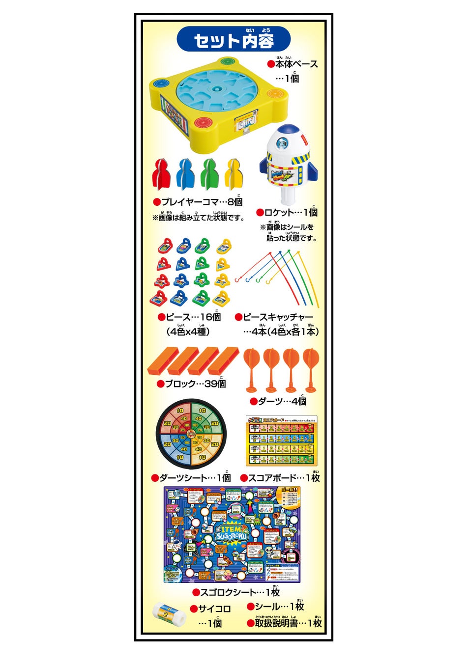 - ゲームにはロケットショック、スクリューダーツ、スペースフィッシング、スピンバランスタワー、ローリングアンバランス、シューティングカーリング、アイテムスゴロクが含まれる