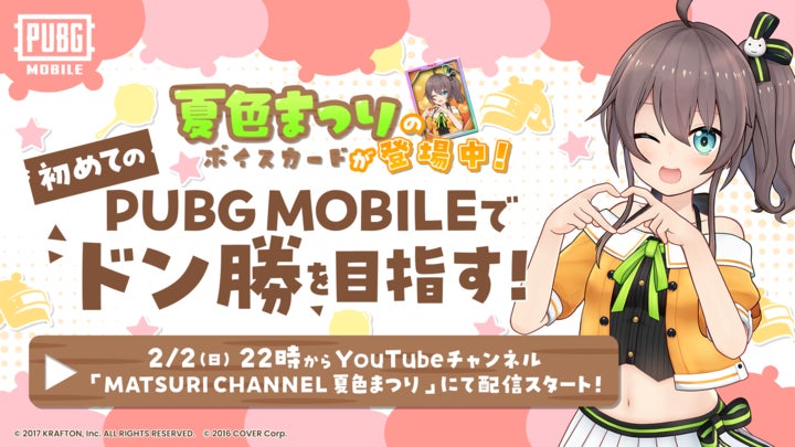 さらに、2月2日には夏色まつりが自身のYouTubeチャンネルで『PUBG MOBILE』をプレイする配信も行われます。