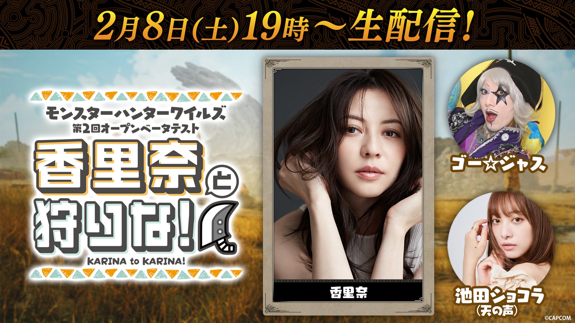 2025年2月8日(土)19時より、モデルの香里奈さんと芸人の宇宙海賊ゴー☆ジャスさんによる『モンスターハンターワイルズ』の実況生配信「香里奈と狩りな!」が開催されます。